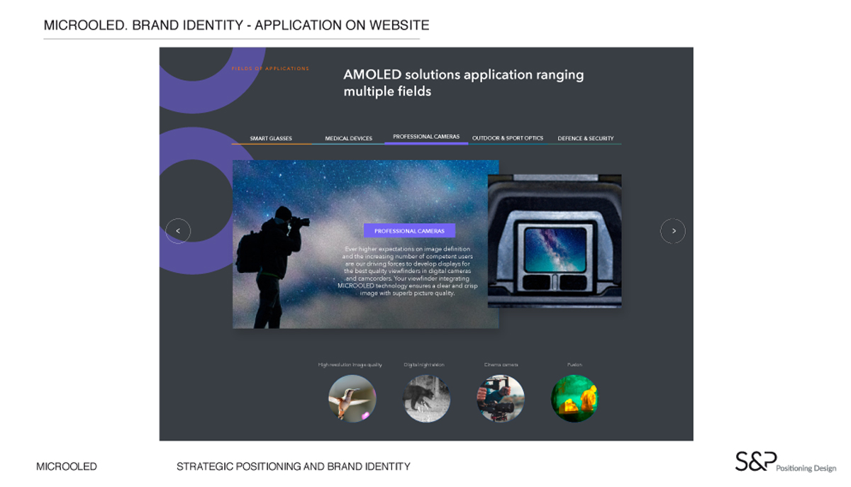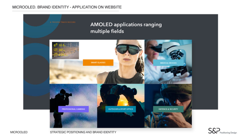 Microoled supplies solutions and components to different markets. The new color palette distinguishes the various fields of application within the different communication tools, such as website and presentation templates.